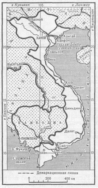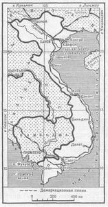 По этому соглашению была установлена временная демаркационная (разграничительная) линия между Северным и Южным Вьетнамом, в основном по 17-й параллели. Соглашениями предусматривалось провести в июле 1956 г. во всем Вьетнаме всеобщие выборы. Но южновьетнамские марионетки при содействии США сорвали всеобщие выборы ипровели фальсифицированную комедию отдельных выборов в Южном Вьетнаме.
