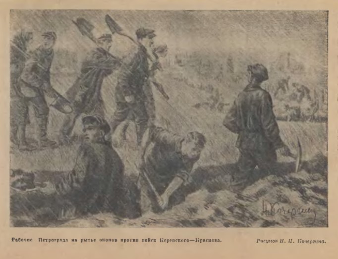Рабочие Трубочного завода, Сименс-Гальске и Посселя прибежали прямо с работы в комендатуру с требованием дать оружие и отправить их на позиции к Пулкову и Царскому Селу, где происходили бои. Разобрали за день 3 тысячи винтовок. Рабочие продолжали прибывать. Винтовок не было. Брали ломы, лопаты и шли на позиции рыть окопы.