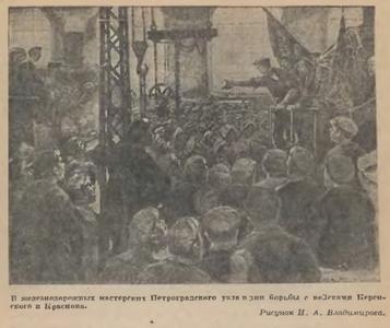 Это подаёт свой голос внешний фронт. Ликвидируя предательский мятеж юнкеров и заботясь о порядке в городе, в то же время Военно-революционный комитет ни на секунду не должен забывать, что враг стоит на подступах к красному Питеру; что во мраке туманной ночи идёт ожесточённый бой, льётся кровь. На заседании комитета выносятся быстрые, короткие, решительные постановления.